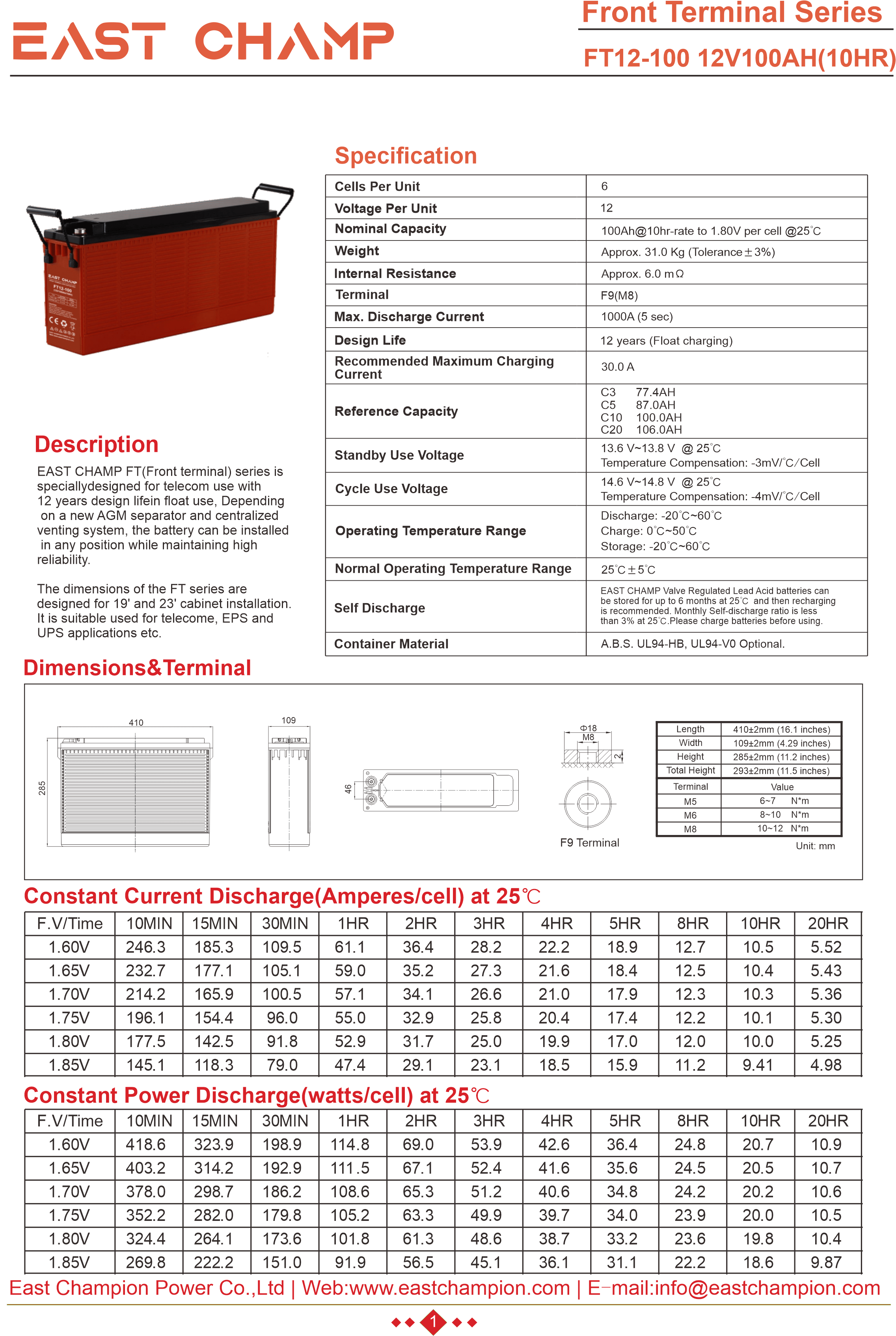 EAST CHAMP Front Terminal Battery is specifically engineered for telecom applications, this battery boasts a design life exceeding 10 years in float service. The long, narrow front terminals facilitate straightforward installation and maintenance. Additionally, the battery is versatile enough to be installed in any orientation, ensuring compatibility with standard cabinets and racks.
