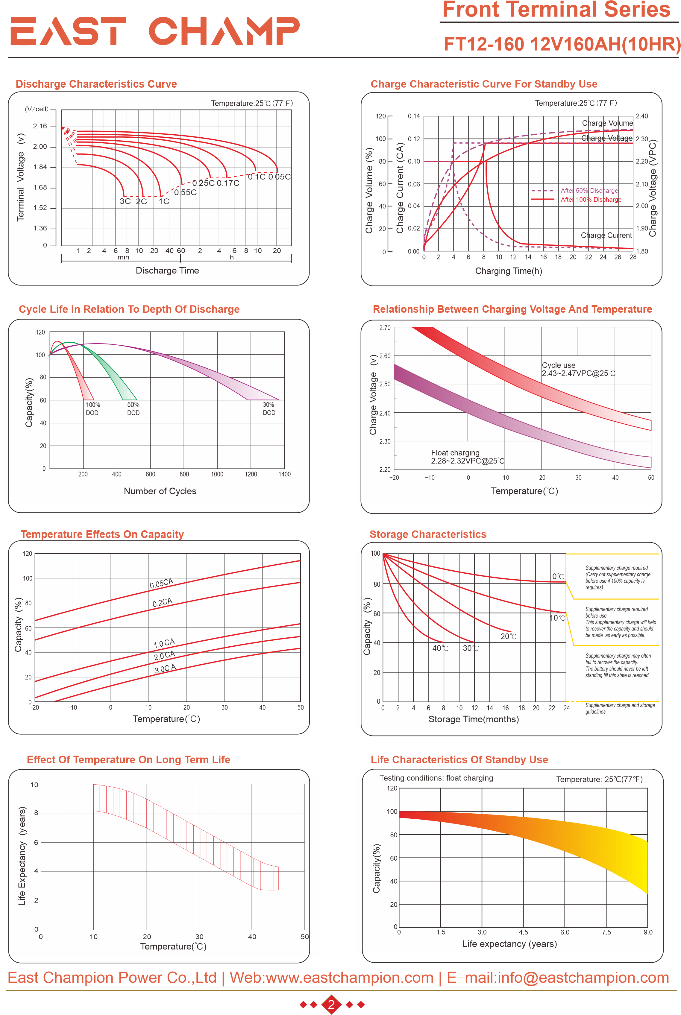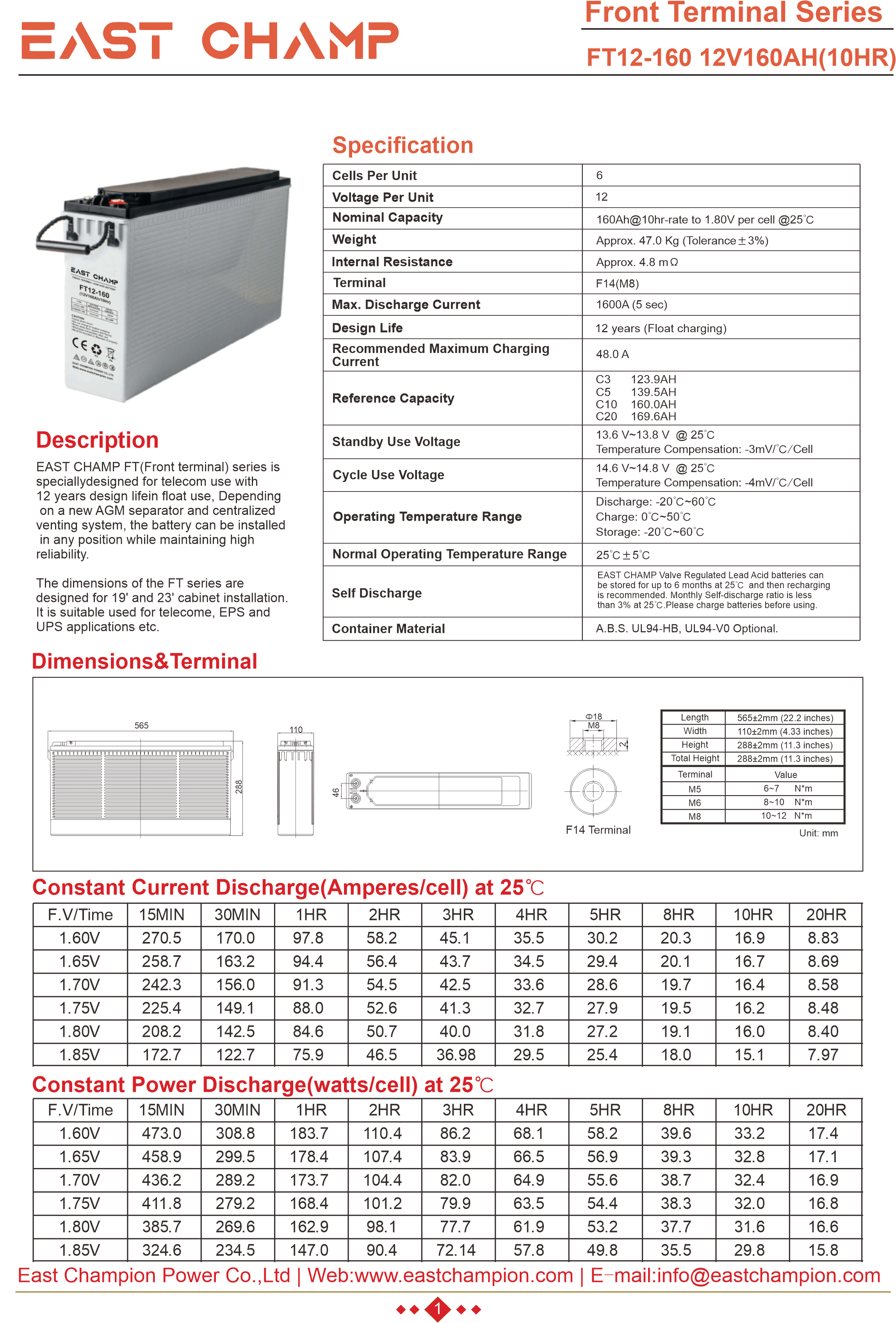 EAST CHAMP Front Terminal Battery is specifically engineered for telecom applications, this battery boasts a design life exceeding 10 years in float service. The long, narrow front terminals facilitate straightforward installation and maintenance. Additionally, the battery is versatile enough to be installed in any orientation, ensuring compatibility with standard cabinets and racks.