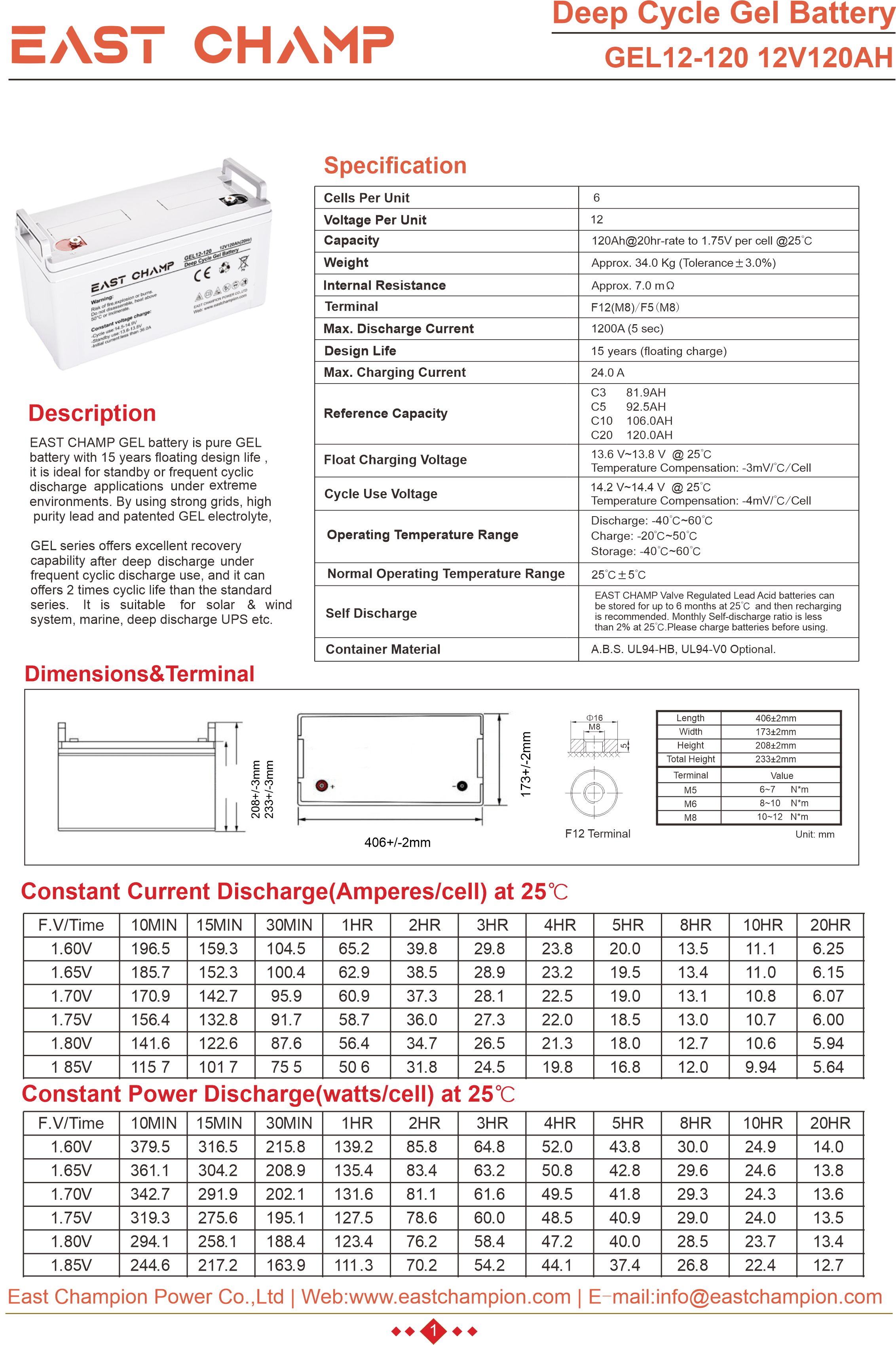 EAST CHAMP Gel Battery utilizes advanced sealed gel technology, engineered to deliver highly reliable, maintenance-free power specifically tailored for renewable energy applications. Leveraging the benefits of gel technology along with an optimized grid and plate design, the EAST CHAMP Gel Battery provides exceptional power output and reliability, ensuring optimal performance for your equipment.