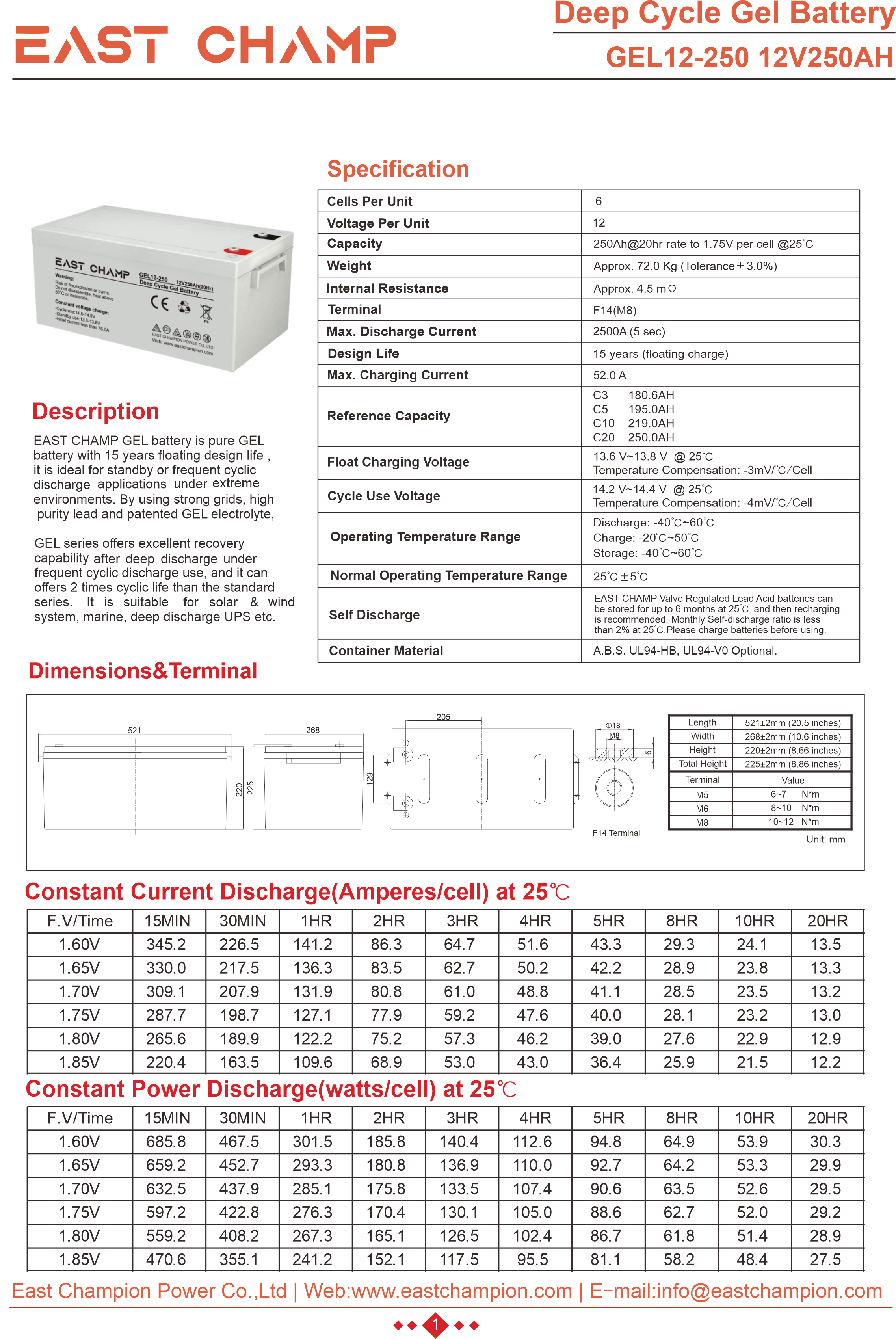 EAST CHAMP Gel Battery utilizes advanced sealed gel technology, engineered to deliver highly reliable, maintenance-free power specifically tailored for renewable energy applications. Leveraging the benefits of gel technology along with an optimized grid and plate design, the EAST CHAMP Gel Battery provides exceptional power output and reliability, ensuring optimal performance for your equipment.