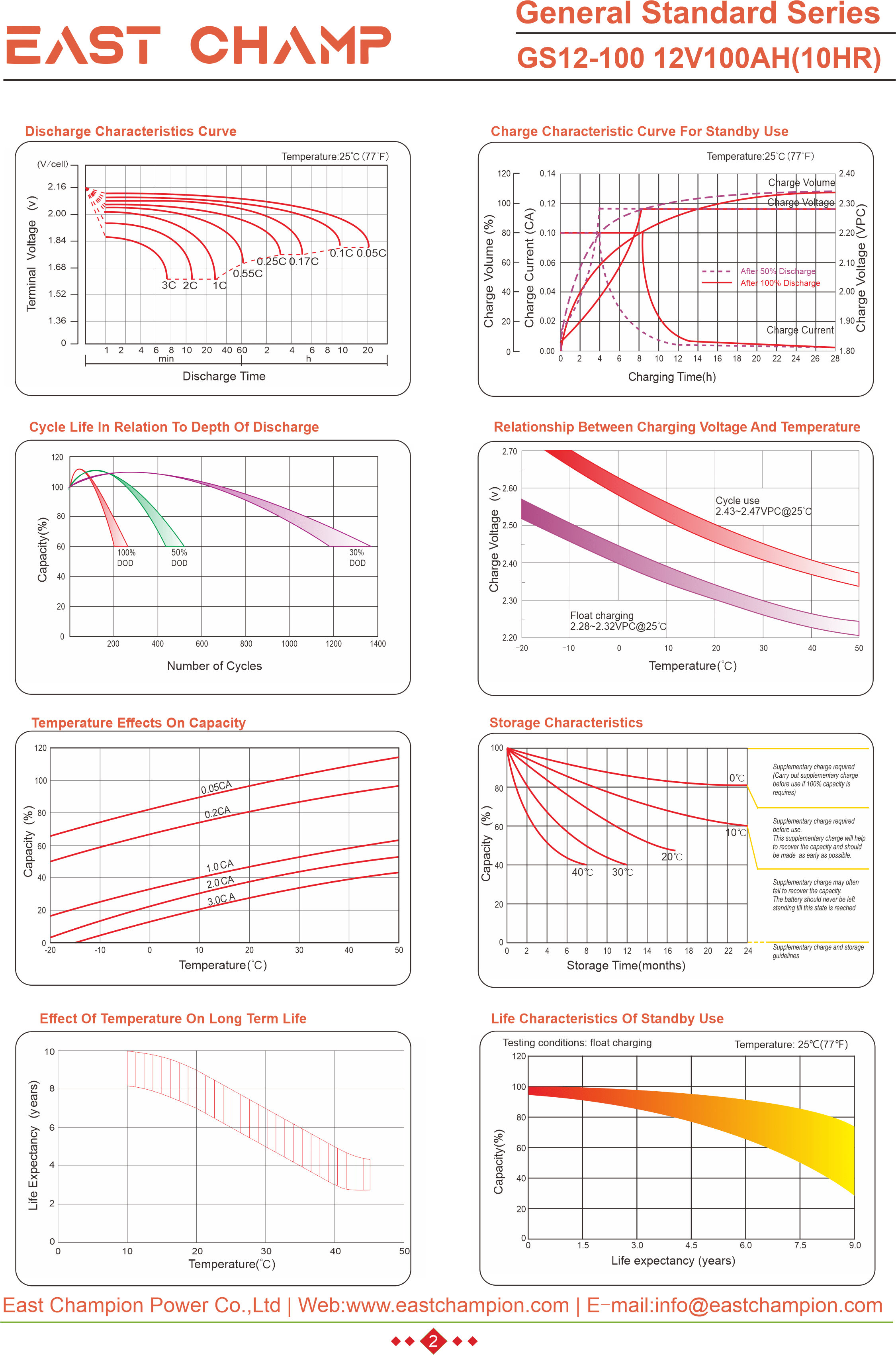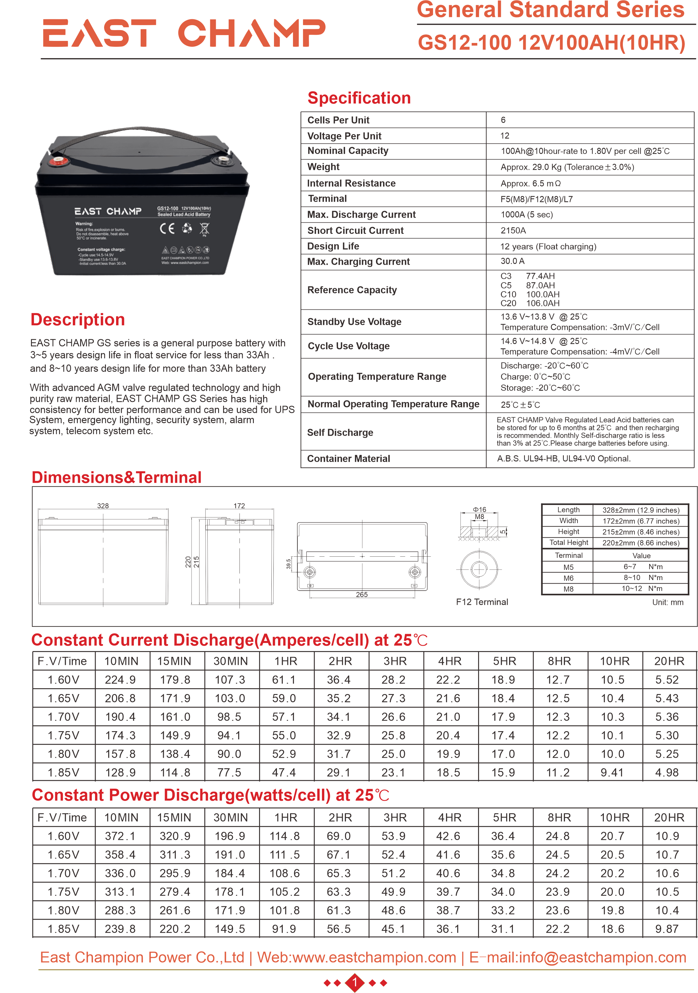 EAST CHAMP GS Series is a general purpose battery designed for a service life of 6 to 8 years under float usage conditions. Utilizing advanced AGM valve-regulated technology and high-purity raw materials, the GS Series ensures exceptional consistency, delivering superior performance and dependable standby service life. This battery is ideal for applications including uninterruptible power supplies (UPS), emergency power systems (EPS), medical equipment, emergency lighting, and security systems.