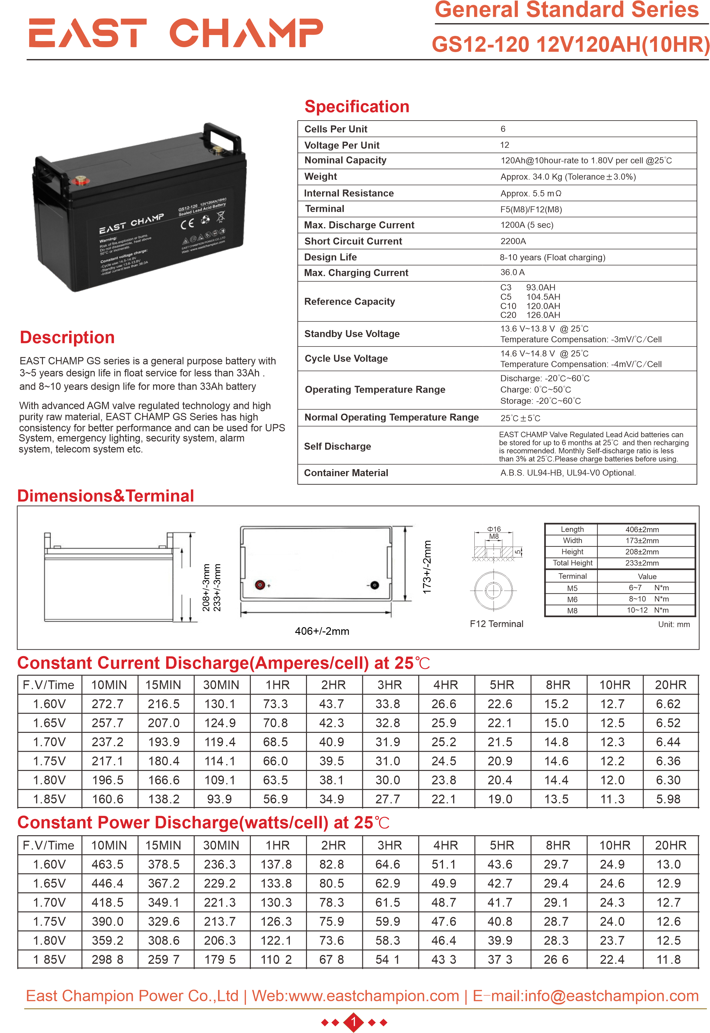 EAST CHAMP GS Series is a general purpose battery designed for a service life of 6 to 8 years under float usage conditions. Utilizing advanced AGM valve-regulated technology and high-purity raw materials, the GS Series ensures exceptional consistency, delivering superior performance and dependable standby service life. This battery is ideal for applications including uninterruptible power supplies (UPS), emergency power systems (EPS), medical equipment, emergency lighting, and security systems.