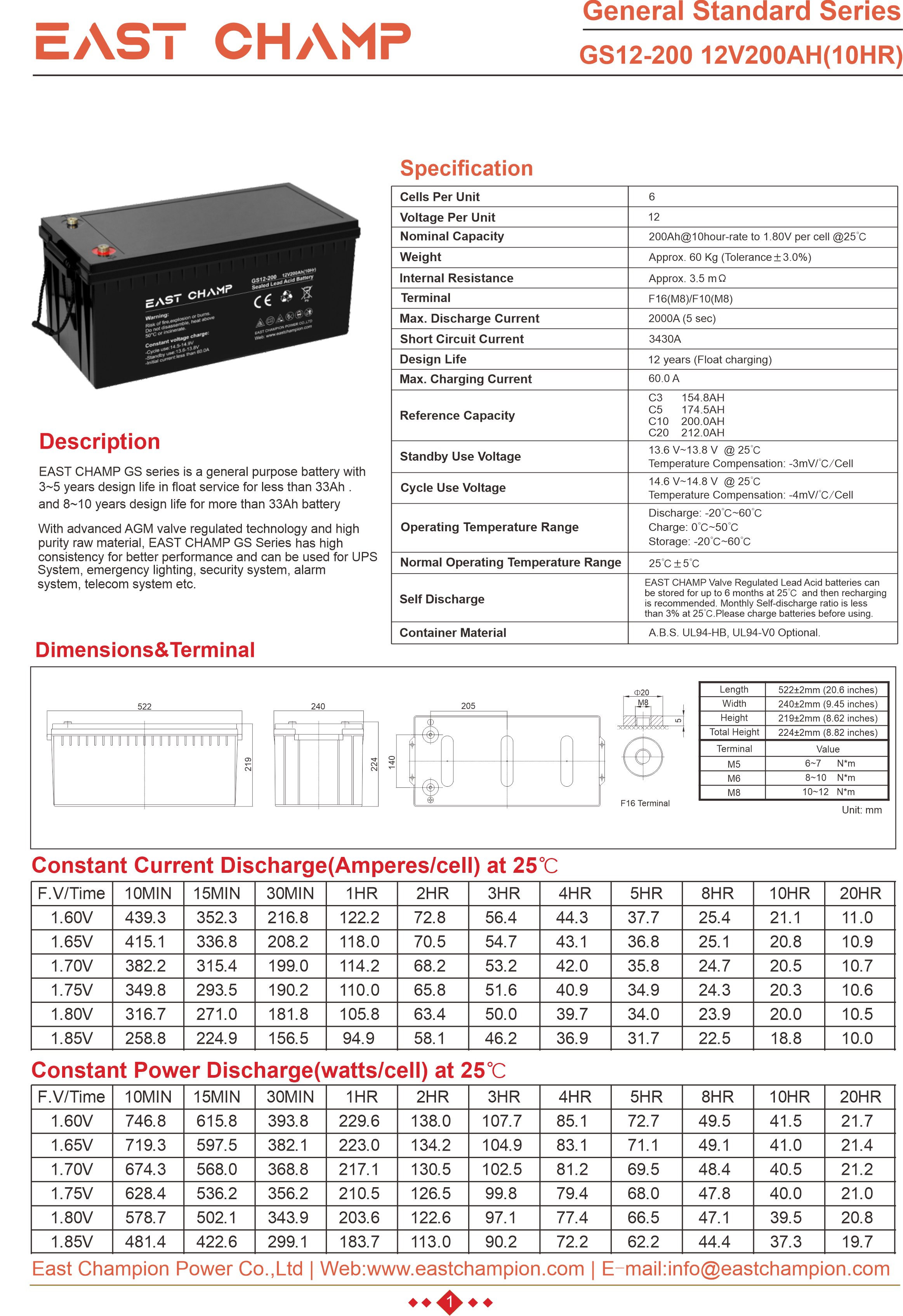 EAST CHAMP GS Series is a general purpose battery designed for a service life of 6 to 8 years under float usage conditions. Utilizing advanced AGM valve-regulated technology and high-purity raw materials, the GS Series ensures exceptional consistency, delivering superior performance and dependable standby service life. This battery is ideal for applications including uninterruptible power supplies (UPS), emergency power systems (EPS), medical equipment, emergency lighting, and security systems.