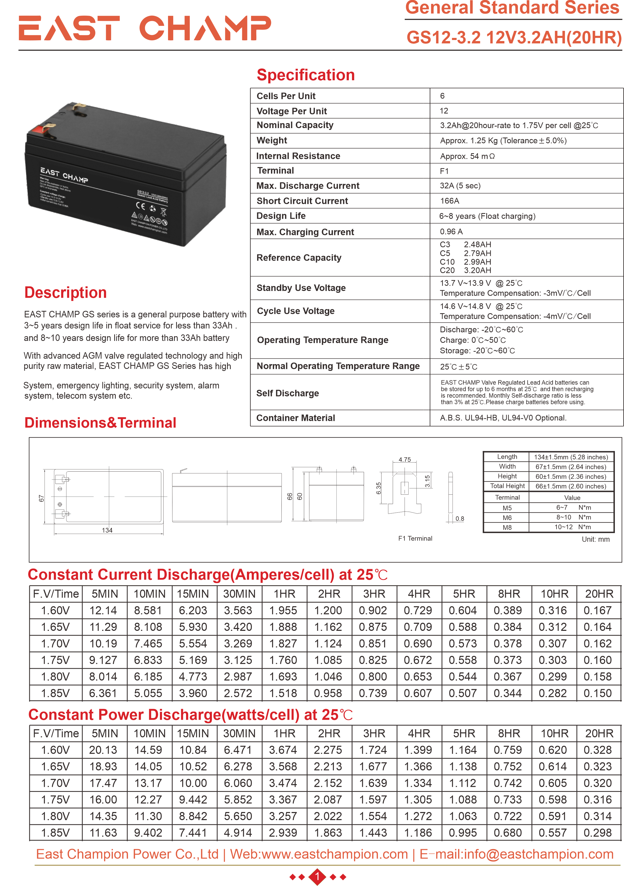 EAST CHAMP GS Series is a general purpose battery designed for a service life of 6 to 8 years under float usage conditions. Utilizing advanced AGM valve-regulated technology and high-purity raw materials, the GS Series ensures exceptional consistency, delivering superior performance and dependable standby service life. This battery is ideal for applications including uninterruptible power supplies (UPS), emergency power systems (EPS), medical equipment, emergency lighting, and security systems.