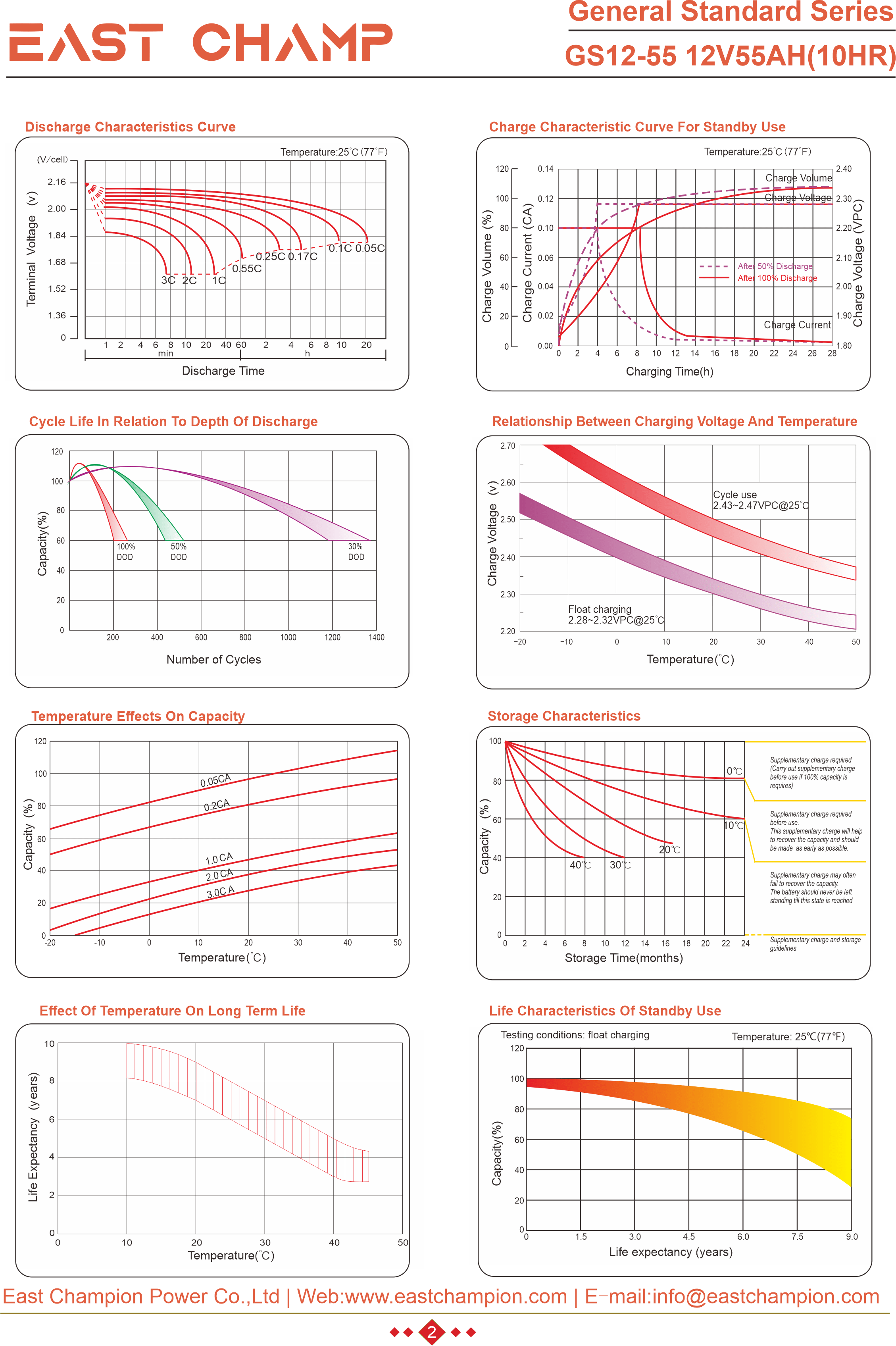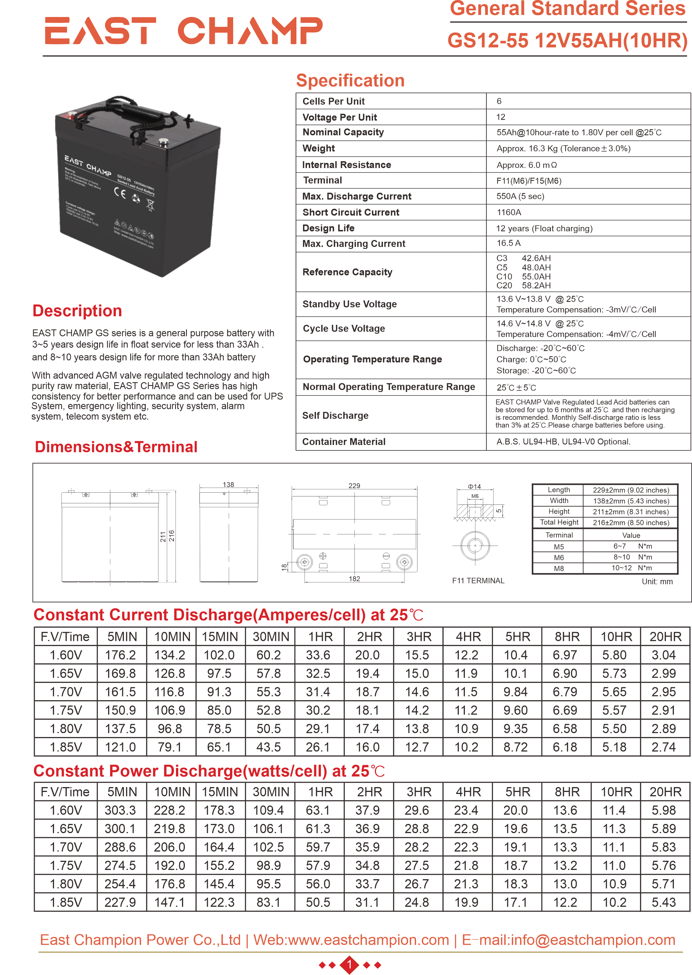 EAST CHAMP GS Series is a general purpose battery designed for a service life of 6 to 8 years under float usage conditions. Utilizing advanced AGM valve-regulated technology and high-purity raw materials, the GS Series ensures exceptional consistency, delivering superior performance and dependable standby service life. This battery is ideal for applications including uninterruptible power supplies (UPS), emergency power systems (EPS), medical equipment, emergency lighting, and security systems.