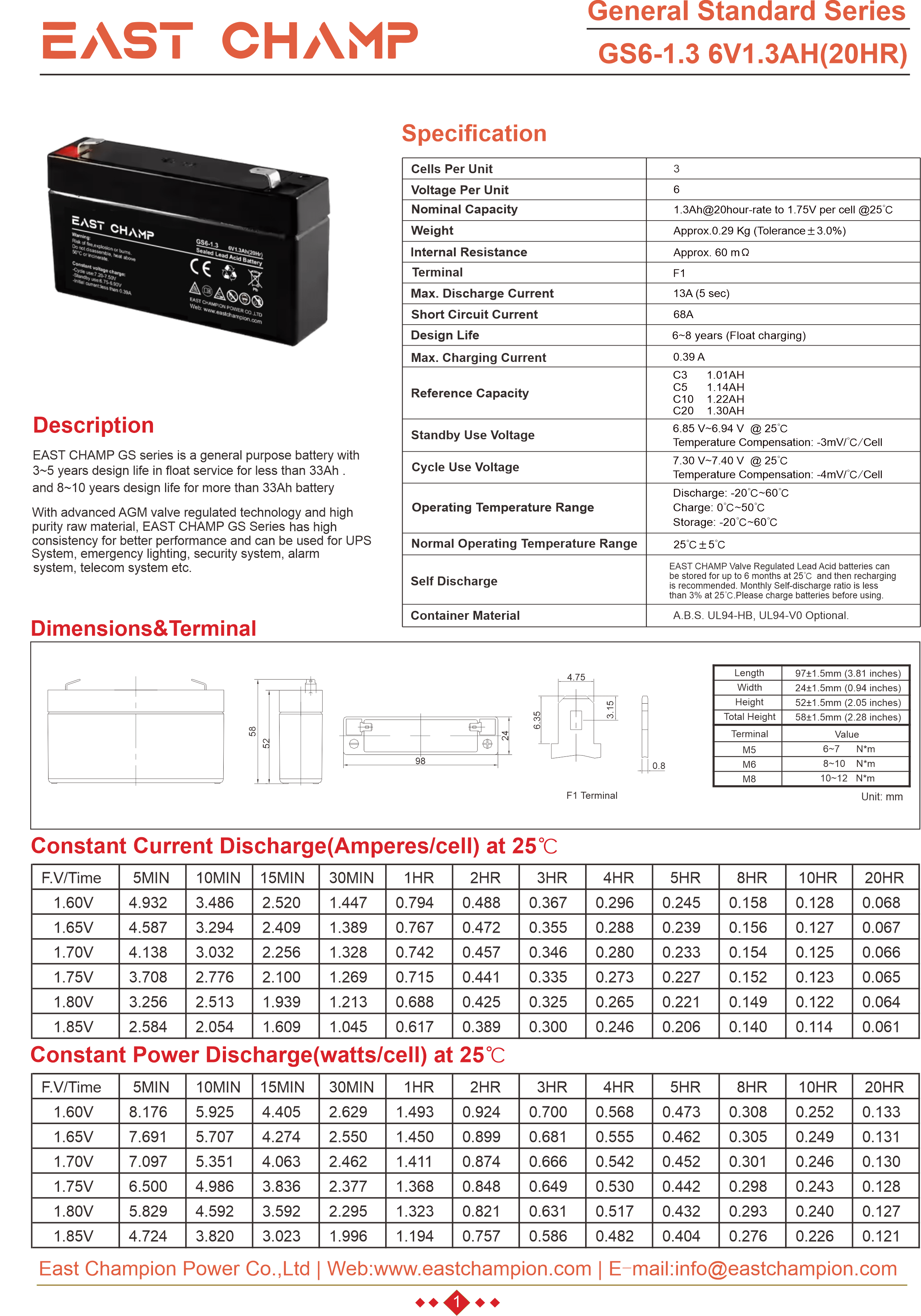 - Battery Model: GS6-1.3/ 6V1.3AH