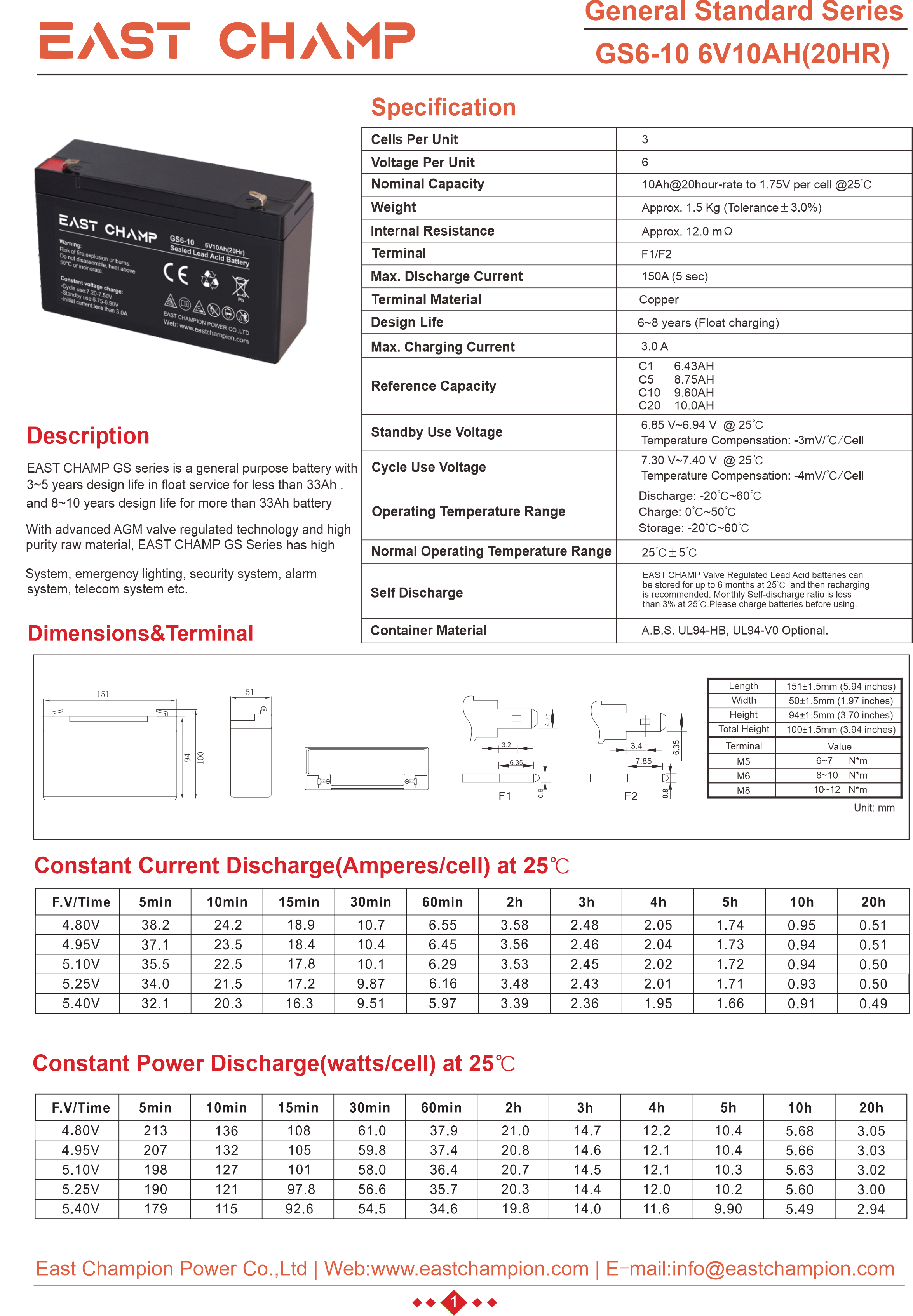 EAST CHAMP GS Series is a general purpose battery designed for a service life of 6 to 8 years under float usage conditions. Utilizing advanced AGM valve-regulated technology and high-purity raw materials, the GS Series ensures exceptional consistency, delivering superior performance and dependable standby service life. This battery is ideal for applications including uninterruptible power supplies (UPS), emergency power systems (EPS), medical equipment, emergency lighting, and security systems.