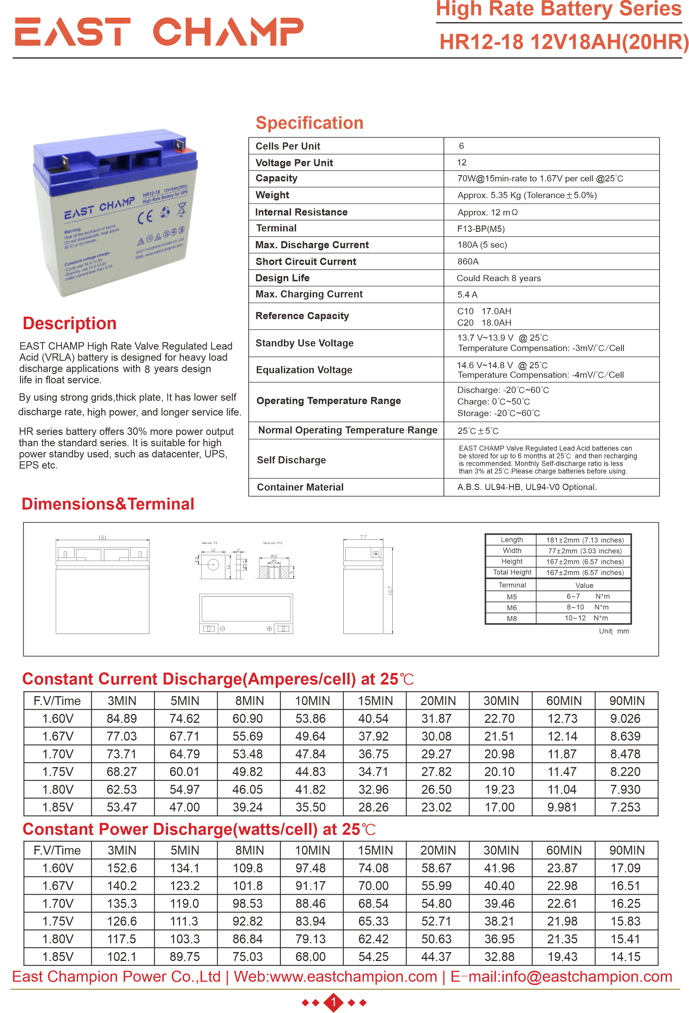 EAST CHAMP High Rate UPS Battery is a type of battery specifically designed to deliver power at a high discharge rate, typically for short durations, to ensure the continuous operation of critical systems during power outages. These batteries are commonly used in conjunction with UPS systems to provide backup power for computers, networking equipment, telecommunication systems, and other sensitive electrical devices.